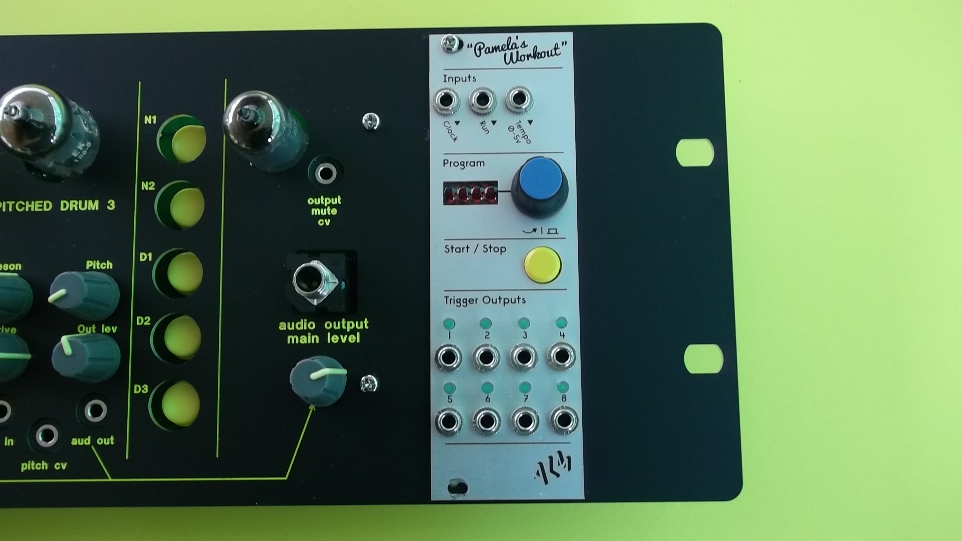 Ample inputs and outputs: mix output (with overdriveable tube preamp), separate outputs for each drum sound channel, external trigger inputs for each drum sound channel, and CV inputs for each drum sound channel. Use any pulse generator to drive the trigger inputs. Very short pulses are recommended for the pitched-drum triggers, and longer pulses for the cymbal triggers. The Triggerman and the Pamela's Workout are both capable of producing different pulse lengths on their separate outputs. They have very different user interfaces, so choose the one you prefer.