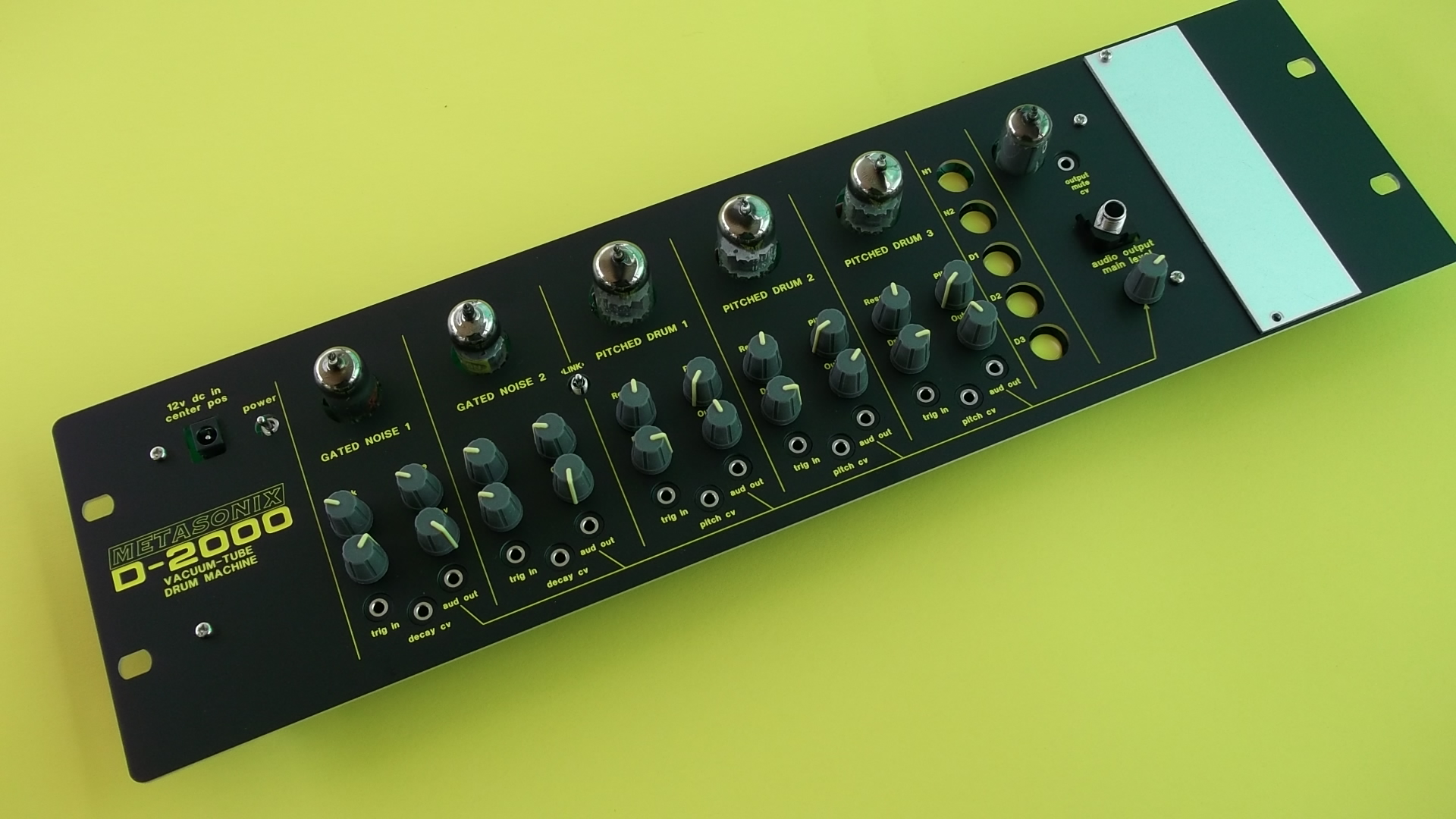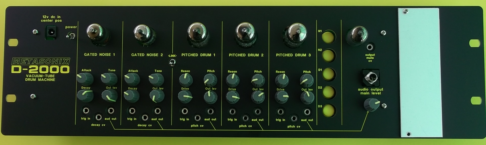 Each of the three tuneable drums ("PITCHED DRUM") is made from a vacuum tube ringing bandpass filter, and can be tuned to sound from below 20 Hz to over 2 kHz using a "vactrol" photoresistor. They are also tunable with external control voltages (varying 0-5v), allowing complex patterns to be built up with external CV or pulse sources. Resonance of each PITCHED DRUM circuit is set by front-panel controls. Each circuit also has a "Drive" control, allowing the pulse input to be varied from complete shutoff (silence) to full sounding to overdrive. The PITCHED DRUM circuits are very similar to the RK4 module.